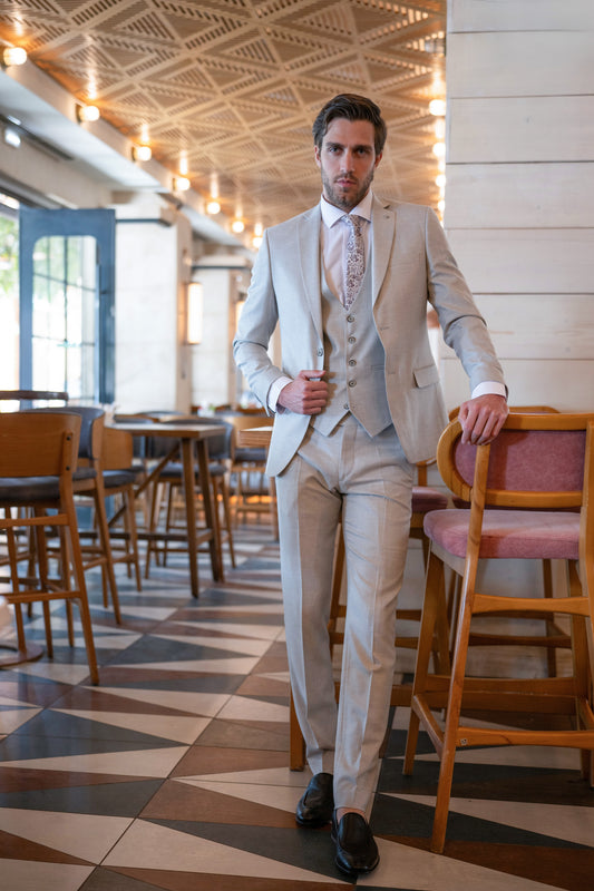 Κοστούμι Boston σε Ανοιχτή Γκρι απόχρωση. Αυτό το 3-piece suit περιλαμβάνει:Σακάκι με άψογη γραμμή χωρίς έντονες λεπτομέρειεςΓιλέκο λιτό με εκλεπτυσμένο χαρακτήρα Παντελόνι καλοραμμένο σε...